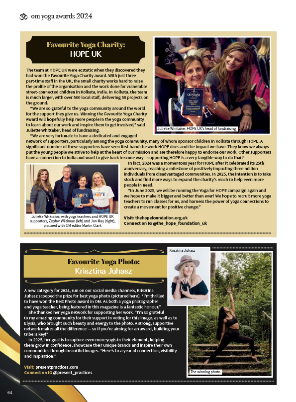 The article celebrates HOPE UK’s Award as ‘Favourite Yoga Charity’ which was presented at the OM Yoga Show, last October. Pages 62 and 64 of the magazine has contributions from Juliette Whittaker, Head of Fundraising, and Yoga For HOPE supporters Zephyr Wildman and Jan May.